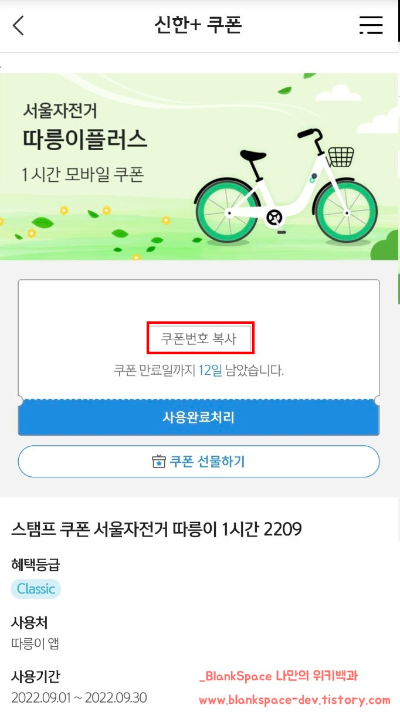 쿠폰 탭으로 이동하시면, 아래처럼 따릉이 플러스라는 쿠폰이 존재할 거예요.