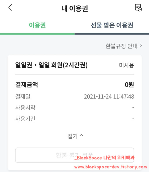 아무튼 쿠폰 등록 및 사용하기까지 끝났습니다. 이제 이용권을 등록하였으니 제대로 등록되어 있는지 확인해봐야겠죠.