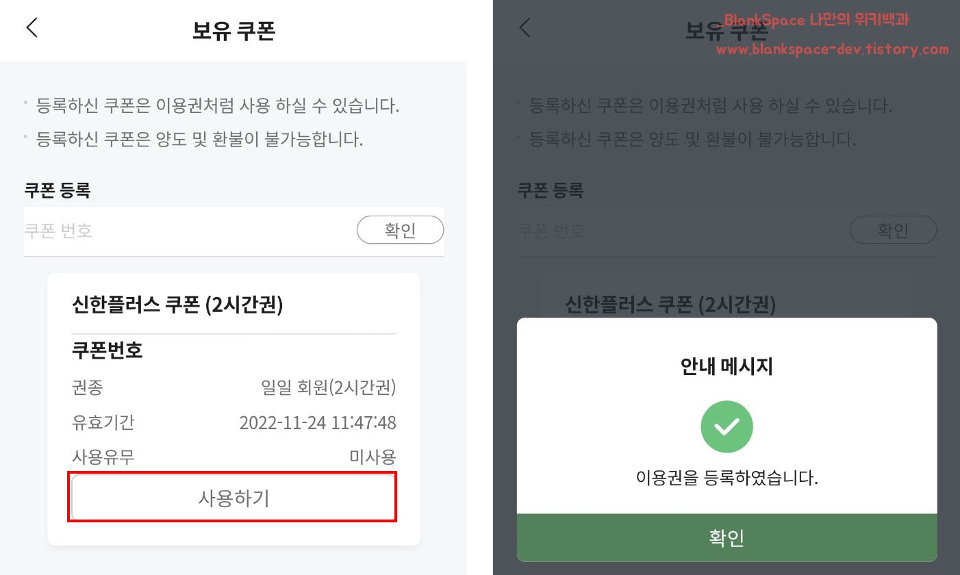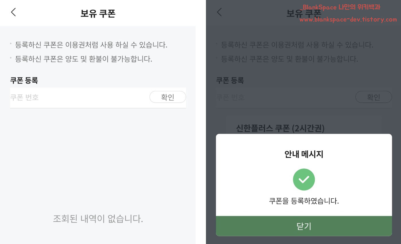 아까 복사했던 번호를 쿠폰 등록 입력 상자에 붙여 넣어주세요. 그리고 확인 버튼을 누르시면 오른쪽 이미지처럼 등록되었다는 안내 메시지가 표시될 거예요.