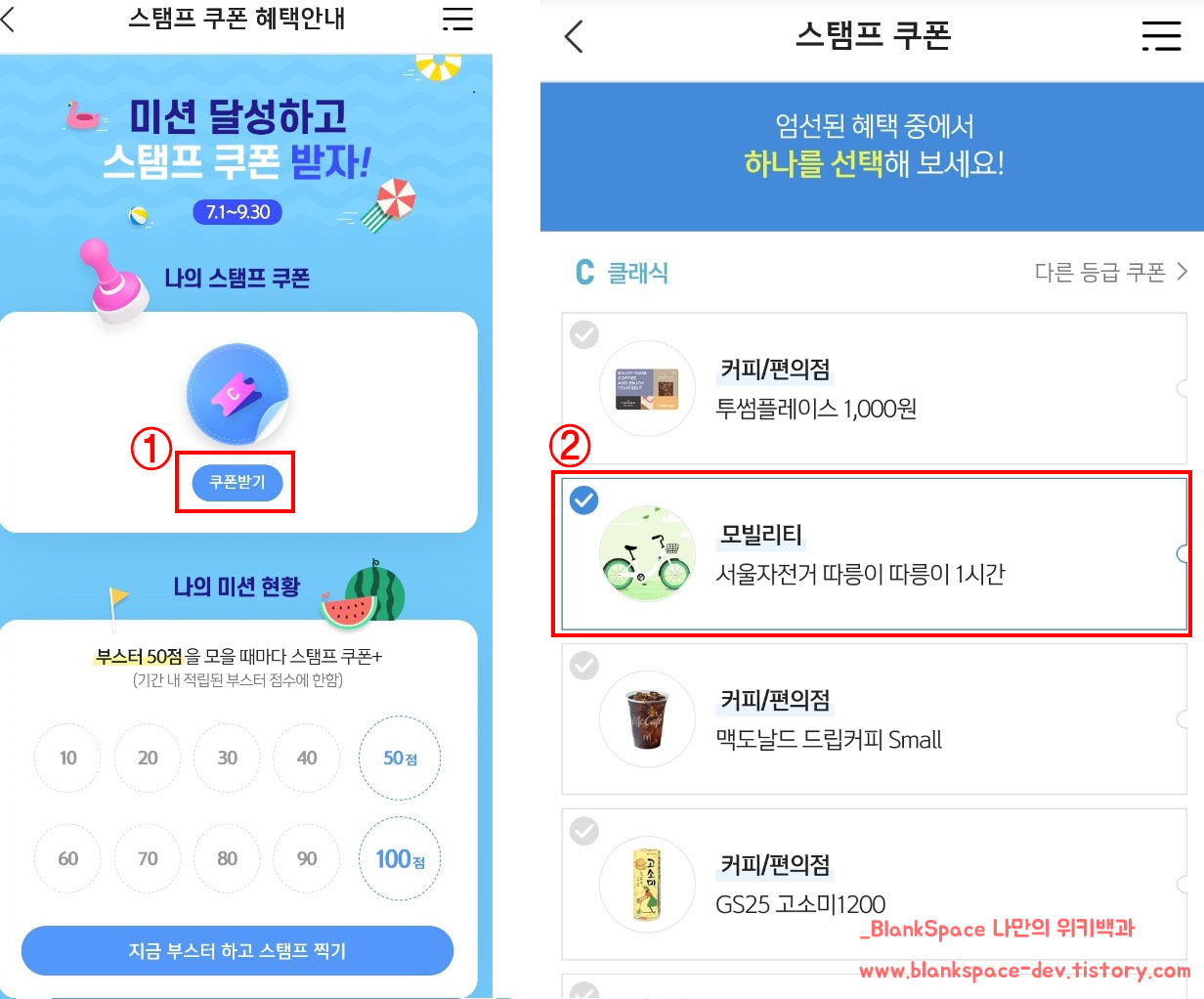 위 방법을 따라 하셨다면 아래처럼 스탬프 쿠폰 혜택 안내라는 화면이 표시될 겁니다.