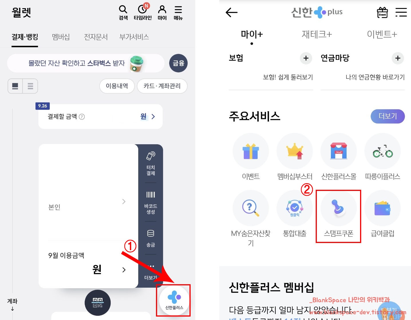 왼쪽 이미지처럼 하단 오른쪽에 있는 신한플러스 이미지를 눌러주세요. 이후, 오른쪽 이미지에서 스탬프쿠폰 이미지를 눌러주시면 됩니다.