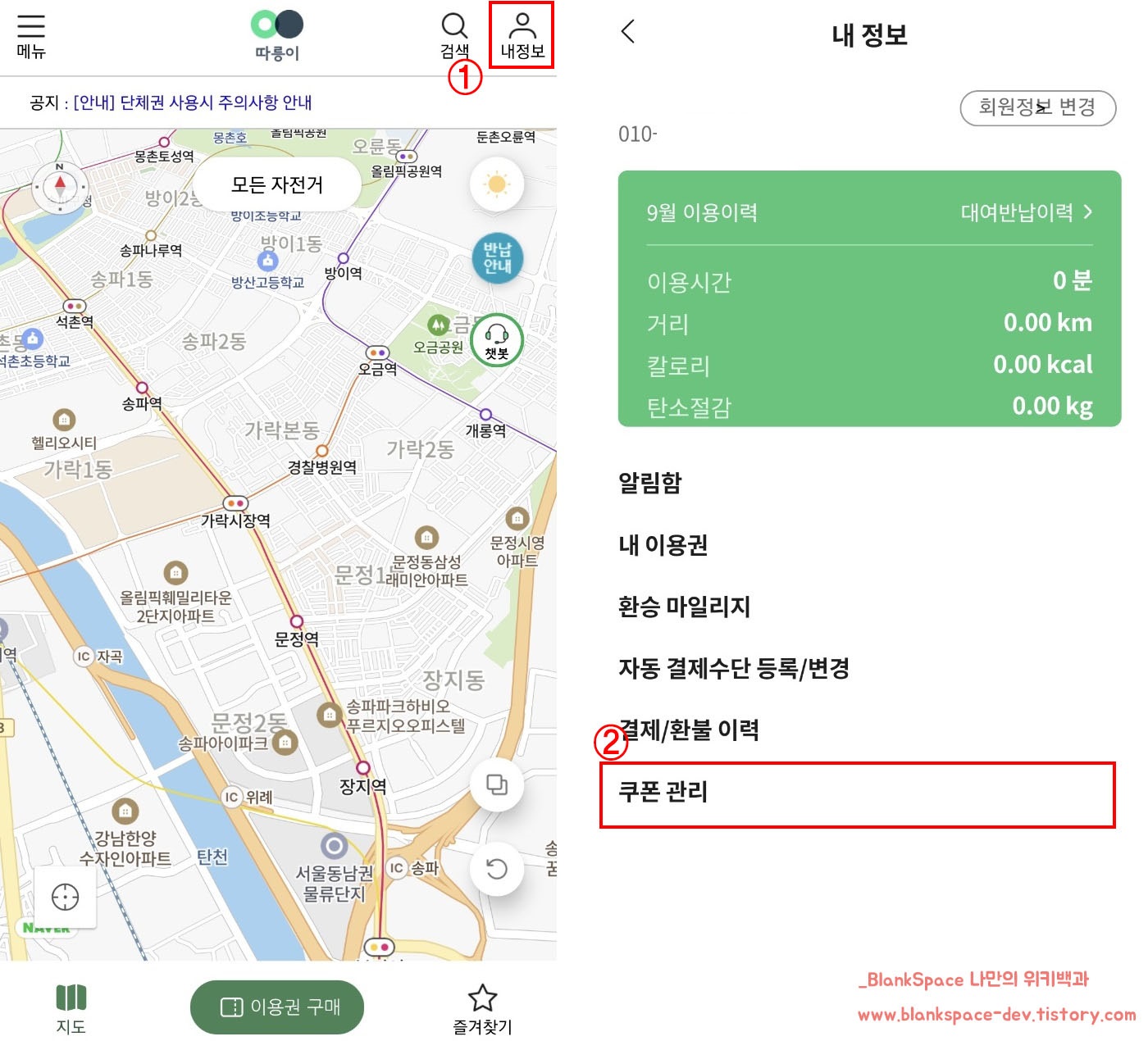 그리고, 오른쪽 이미지처럼 내 정보 화면이 나왔다면 쿠폰 관리 탭을 눌러주세요.