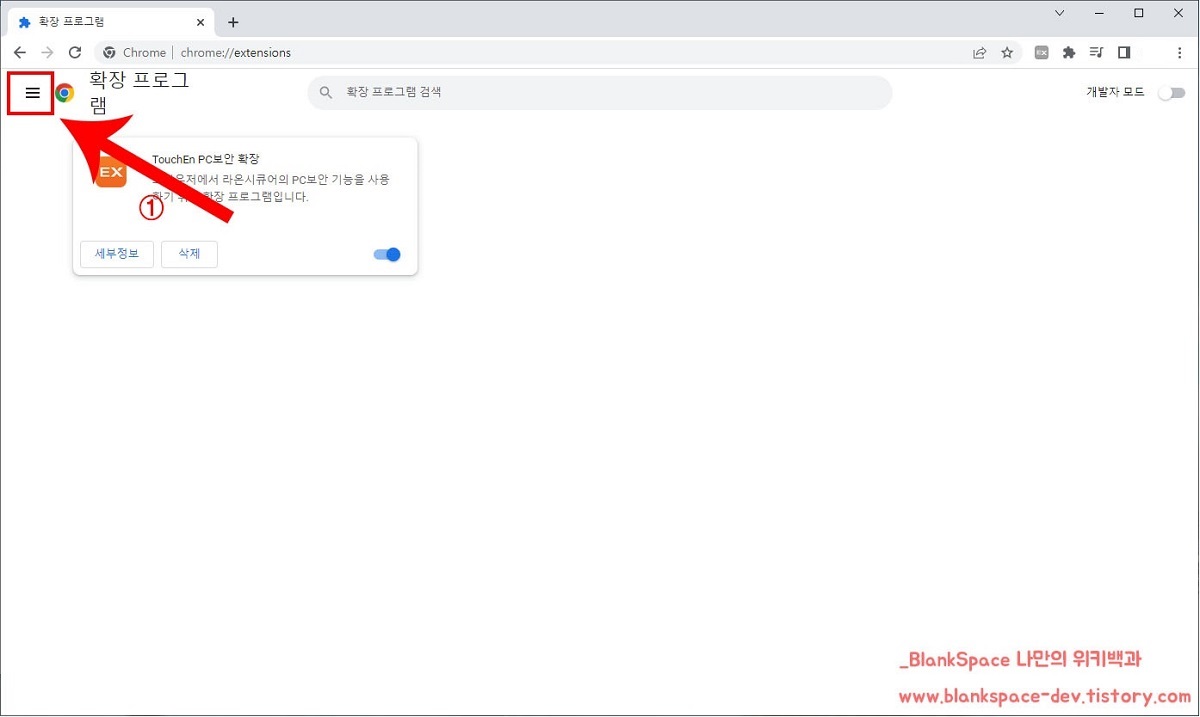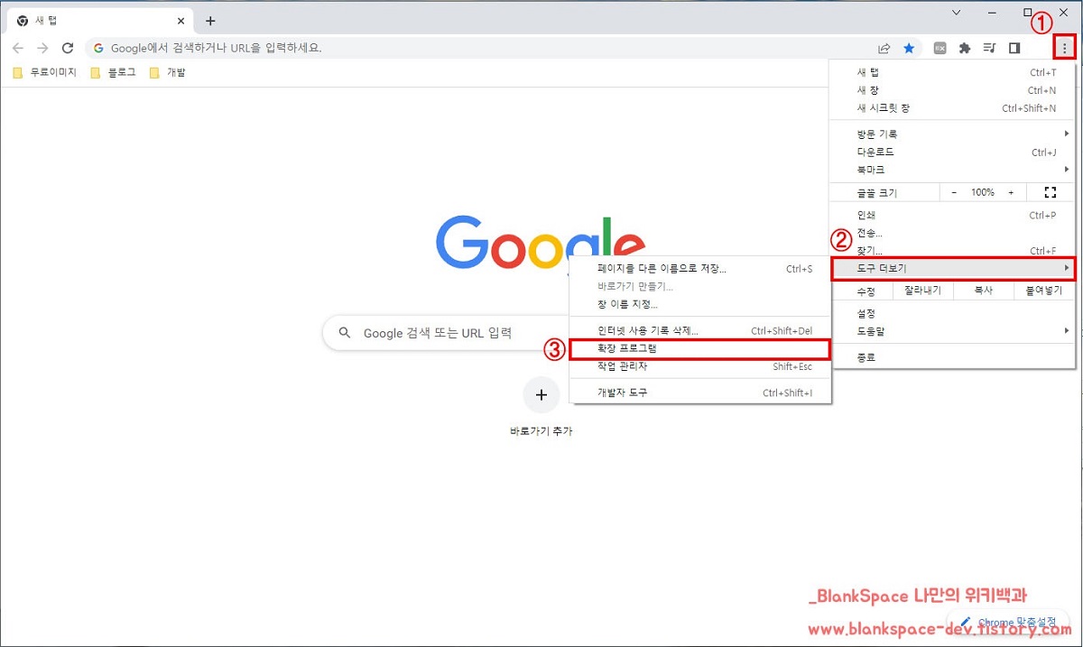 아래처럼 상단 오른편에 있는 점 세 개를 누르신 후, 도구 더보기 - 확장 프로그램 순으로 눌러주세요.