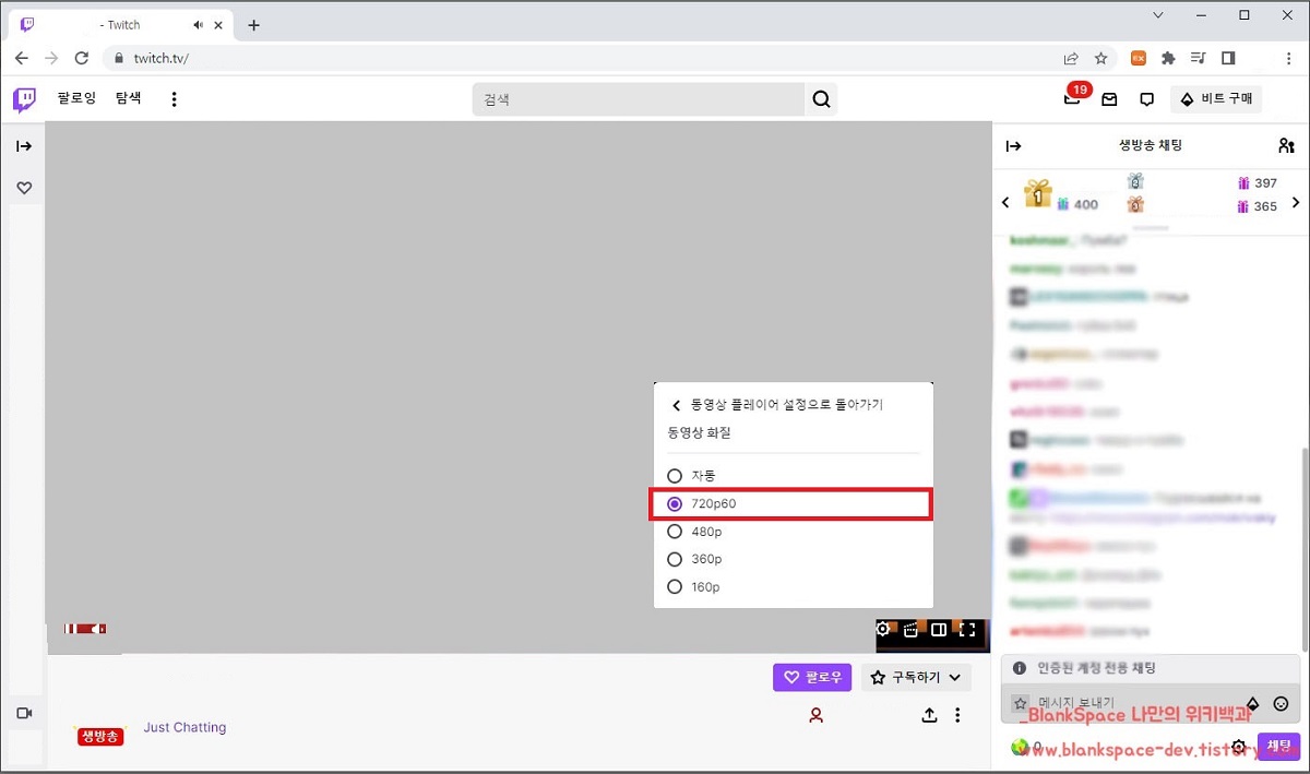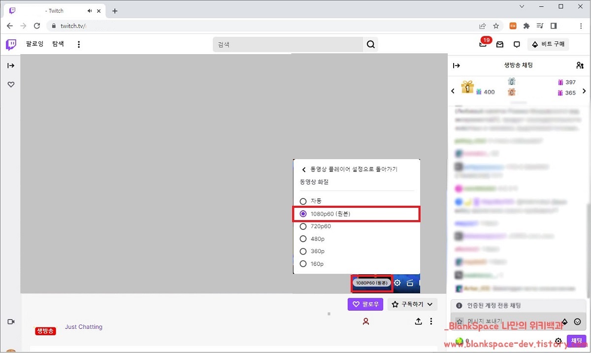 바로 트위치 방송을 들어가 보겠습니다. 아래 이미지를 보시면 위에 와는 다르게 동영상 화질에서 1080p60을 선택할 수 있는 것을 보실 수 있을 거예요.