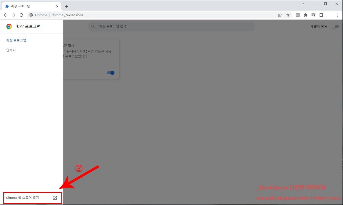 왼편에 메뉴창이 열리실 텐데요. 하단에 보이는 Chrome 웹 스토어 열기 부분을 눌러주세요.