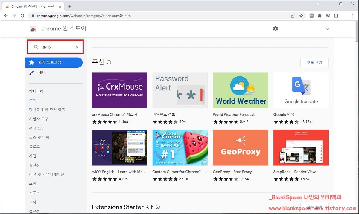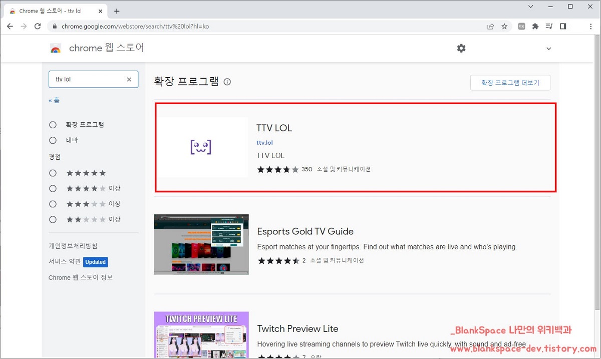 chrome 웹 스토어 화면으로 이동하셨다면, 왼편에 있는 입력창에 ttv lol을 입력해주세요.