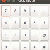 · GtkTable은 열과 행을 배치할 수 있다. 예제 12345678910111213141516171819202122232425262728293031323334353637#include int main(int argc, char *argv[]) { int i; int j; int pos = 0; GtkWidget *window; GtkWidget *table; GtkWidget *button; gchar *values[20] = { "7", "8", "9", "/", "~", "4", "5", "6", "*", "!", "1", "2", "3", "-", "@", "0", ".", "=", "+", "#" }; gtk_init(&argc, &argv); window = gtk_window_new(GTK..